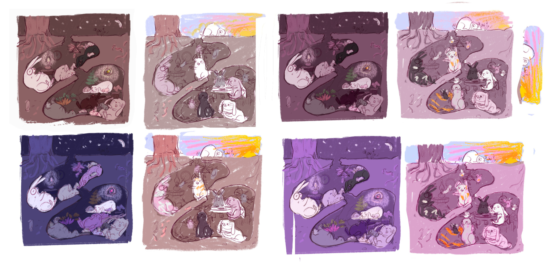 I try to get compositions right in the sketch stage, keeping the burrows the same, but pushing the character and poses of the rabbits in each scene. I then digitally painted some colour roughs in Procreate to experiment with different palette ideas and how I would best show the day/night scenes, before moving on to the final artwork.